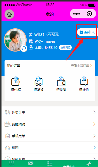 小程序编辑器-设置-会员设置中心增加“签到送积分”,可在后台-营销活动-活动设置-增加签到分享活动,用来增加小程序用户粘性,如下图: