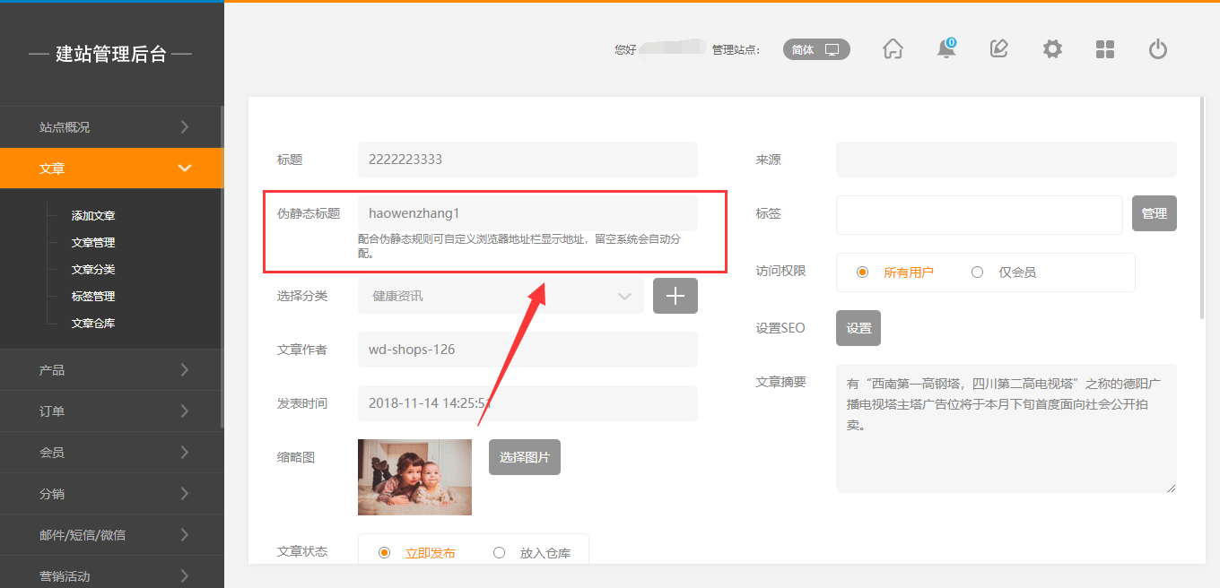 2.前台伪静态规则添加完成后,在建站后台添加文章或产品时,会有“伪静态标题”填写项(非必填),如果没有填写伪静态的标题,系统则会自动分配,如图所示: